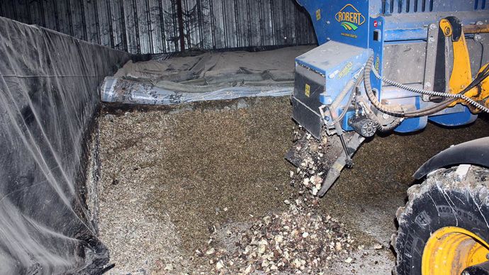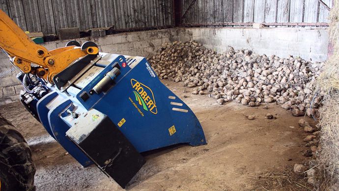 La betterave a été stockée sous un hangar. « Il faut concevoir un tas qui respire : 1,50 à 2 m de hauteur. Début décembre, il a gelé à - 6°C. J’avais placé un thermomètre sur le tas qui n’est pas descendu sous le 0°C. » Les racines sont reprises avec un godet hacheur de marque Robert et coupées devant le front d’attaque du silo de maïs pour composer la ration : 12 kg de maïs, 2 kg d’ensilage d’herbe, 3 kg de betterave et 4 kg de correcteur azoté. « Cela me prend dix minutes supplémentaires d’introduire la betterave dans la ration. Avec une variété assez riche en matière sèche comme Corindon (20 % de MS), le fait de couper les racines facilite la consommation. » La ration est ainsi équilibrée à 30 litres/vache.