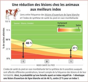 Lors des plans d’accouplement, éviter les taureaux négatifs sur ces caractères doit donc contribuer à limiter l’incidence des boiteries en élevage. À titre d’exemple, le gain d’un point d’index en race montbéliarde réduit presque par deux le risque d’ouverture de ligne blanche (voir l’infographie ci-dessus). « Les index sont une chose, c’est l’usage qu’en feront les éleveurs et les plans d’accouplement qui feront l’évolution génétique des populations, mais le potentiel d’amélioration existe », souligne Gilles Thomas.