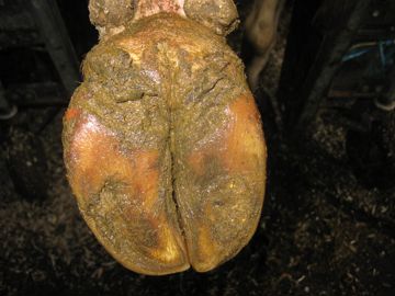 Enfin, sur le volet de l’alimentation, un léger déficit d’état corporel a été mis en évidence. Or une perte d’état affecte également le coussinet adipeux podal qui joue le rôle d’amortisseur entre la corne et le vif du pied, ce qui peut expliquer l’apparition de bleimes, ulcères ou lignes blanches. La mesure des corps cétoniques sur des vaches en début de lactation (< 60 jours) ne révélera pas de mobilisation excessive des réserves. Mais une transition alimentaire trop rapide à la mise-bas, associée à un défaut de valorisation de la ration, a pu contribuer à une baisse d’état corporel : dans les trois jours post-vêlage, la quantité de concentré passait de 1,5 kg à 5 kg/vache.