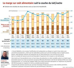 Ce mode de rationnement s’accompagne de l’acidification de la ration de préparation au vêlage. Il autorise une production moyenne de 37,7 litres de lait/vache/jour, à 45,3 de TB et 34 de TB au mois de novembre, soit une moyenne technique,de 12 690 litres de lait par an à 7 %. « Au regard des dernières analyses, nous avons ajouté 1 kg d’orge pour corriger un manque d’amidon fermentescible dans le rumen. La production par vache a ainsi augmenté de près de 4 litres de lait/vache/jour ce qui laisse à notre portée l’objectif de 13 000 litres de moyenne », estime l’éleveur. Qui conclut : « Le suivi de la marge mois par mois offre un repère indispensable pour remettre en cause cette stratégie en cas d’inversion du contexte économique. »