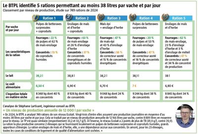 L’autre particularité du Gaec est un recours important aux coproduits, dont les pulpes de betteraves surpressées. Dans l’étude du BTPL, sur 749 rations du réseau Ecolait de 2024, il est l’un des deux élevages qui affichent les meilleurs résultats, l’autre étant également utilisateur de pulpes (ration pulpes de betteraves surpressées + coproduits, voir l’infographie ci-dessus). Tous deux font partie des 23 élevages du réseau Ecolait enquêtés dépassant les 37 litres/vache/jour. « Ils ont un coût alimentaire plus faible grâce aux ressources locales de coproduits. »
