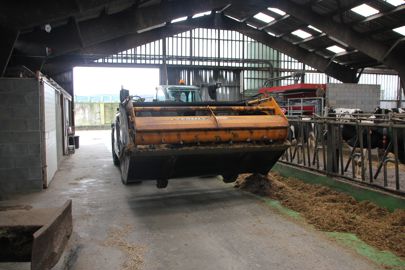 Actuellement, l’EARL possède un Kramer KT 407 de 136 ch affichant une charge maximale de 4 t, qui remplace son ancien télescopique Kramer, le KT 355, de 136 ch également mais qui était limité à seulement 3,5 t. Chaque année, ce télescopique réalise environ 800 heures de travail, dont près de 300 pour le poste alimentation. Le reste du temps est consacré au curage et au paillage des stabulations ainsi qu’aux différentes activités de manutention. Il est équipé de pneus de type industriel, conçus pour rouler sur les surfaces dures, en remplacement des pneus agraires habituels. En effet, ce chargeur passe plus de temps sur les sols bétonnés de l’exploitation que dans les champs.