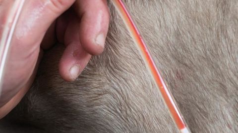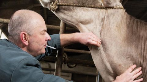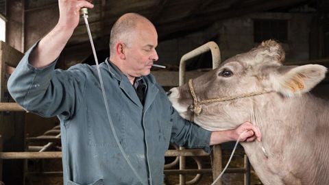 LA VOIE VEINEUSE OFFRE UNE EFFICACITÉ RAPIDE AUX MÉDICAMENTS. Elle est utilisée pour les injections de calcium à la suite d'une fièvre de lait, ou de glucose pour un apport rapide d'énergie. L'intraveineuse (IV) sert aussi pour administrer un antibiotique ou un anti-inflammatoire afin d'obtenir une efficacité immédiate. Enfin, les perfusions permettent de réhydrater les veaux atteints de diarrhée. L'IV est assez facile à réaliser sur un bovin adulte. Sur un veau, trouver la veine jugulaire peut être un peu plus délicat. « Sur une vache laitière, il faut absolument éviter d'utiliser la veine mammaire. Elle est certes très visible, mais c'est une zone de l'animal souvent souillée lors du couchage et en cas d'abcès ou d'hématome, le ralentissement de la circulation sanguine venant du pis peut entraîner une nécrose et compromettre la carrière de l'animal. Une injection dans la veine jugulaire ne présente, elle, quasiment aucun risque », explique Jean-Louis Freyheit. Autre avertissement : ne jamais injecter par intraveineuse un médicament non prévu pour cette voie. Cela pourrait être fatal à l'animal.
