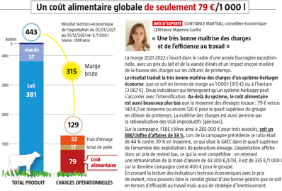 L’ensemble des parcelles reçoit un apport de lisier en automne ou d’engrais complet au printemps. La valorisation de l’herbe est estimée à 11 tonnes de MS d’herbe/ha. Une biomasse essentiellement valorisée au pâturage. Seules 15 % des prairies sont fauchées. Le stock d’ensilage ou d’enrubannage est complété par 10 ha de dérobées implantées après un blé. La production a priori modérée de 8 300 litres/vache est à mettre en balance avec une consommation de concentrés de 700 kg/vache/an.