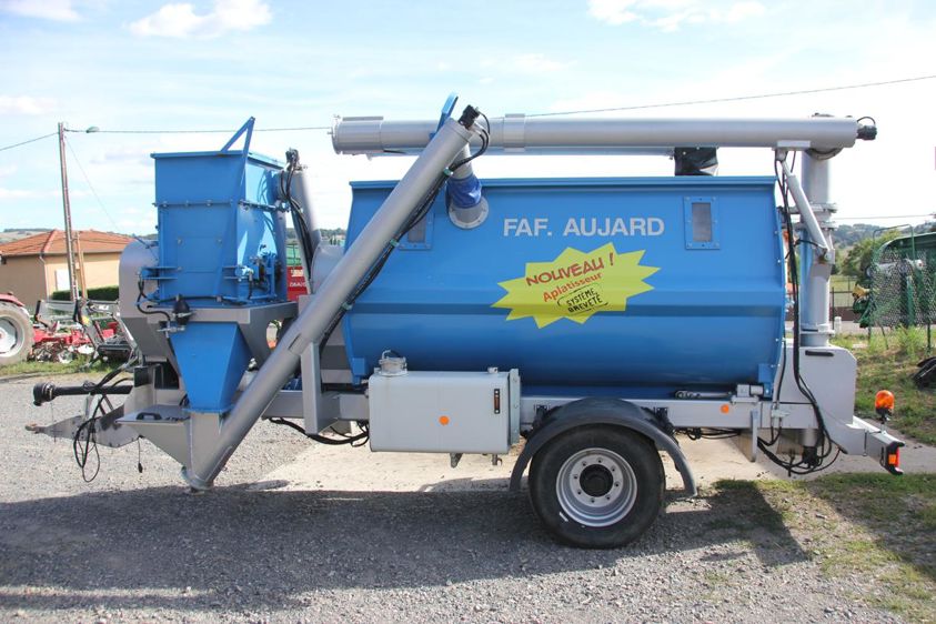 La fabrique d’aliments à la ferme proposée par la SARL Aujard est constituée d’un aplatisseur à deux cylindres, de 350 mm de diamètre pour 500 mm de longueur. L’écartement entre les rouleaux se règle hydrauliquement. Une fois aplati, le grain est transféré dans une cuve horizontale de 5 m3. Un système de pales à rotation lente assure l’homogénéité du mélange sans dénaturer l’aliment.