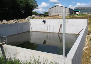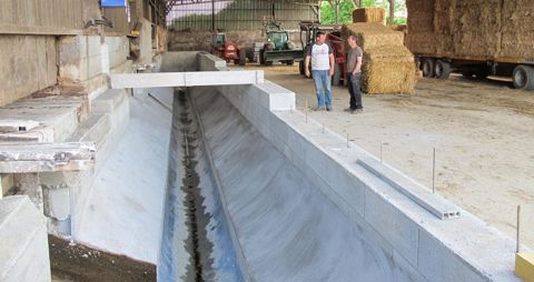 Une fosse de 1  600 m3 qui utilise la gravité Grâce à la pente de 2 %, le lisier rejoint la fosse par gravité. Il a fallu creuser à 6,50 m de profondeur pour construire la fosse de 22 m sur 20 m, pour une capacité totale de 1 600 m3. Le mur de réception du lisier dépasse de 1,20 m les trois autres, pour une hauteur de 3,50 m. Il a deux fonctions : recevoir l'extrémité des 75 m d'aquatube et stopper la terre qui risque de glisser de la pente.  © C.H.