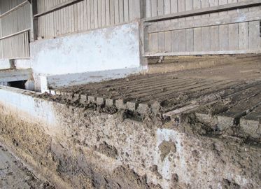 Égouttage du fumier sur plaques de caillebotis meulées Des plaques de caillebotis longues de 2 m sont posées au bout des trois couloirs de raclage larges de 3 à 5 m. Le lisier s'écoule entre les fentes de 4 cm. Pour éviter que la paille bute en leur milieu, sur la jonction de leurs sept barres, les fentes sont prolongées en meulant la partie supérieure. Après quelques mois de fonctionnement, si les fentes sont jugées pas assez larges, la partie inférieure sera aussi meulée pour les ajuster. Le rail du racleur dépasse de 20 cm les caillebotis pour maximiser l'égouttage. © C.H.