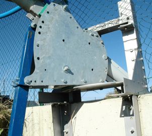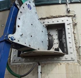 Membrane chaussette étanche. Pour les fosses de plus de 4 m de haut, Peters propose le système traversant, copier-coller des mixeurs utilisés sur les méthaniseurs (comme ici). Il s'agit d'une fenêtre dans la paroi en béton équipée d'une membrane chaussette étanche en Néoprène où est enfilé l'ensemble bras-hélice.