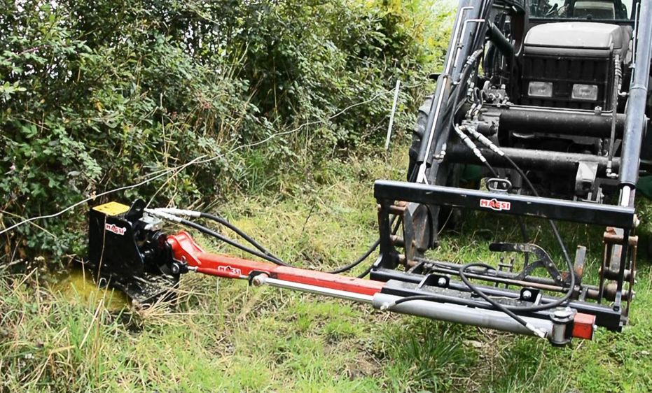 « C'est une petite débroussailleuse à trois couteaux en polyuréthane HD de 2 cm d'épaisseur qui s'adapte sur le chargeur pour pouvoir travailler sous les fils de clôture. Une corvée qui nous prend 15 jours par an à la débroussailleuse manuelle. Les lames de cet outil s'escamotent en cas d'obstacle et le translateur actionné depuis la cabine permet de contourner les piquets. Cette débroussailleuse nécessite une double fonction hydraulique sur le chargeur pour se déplacer latéralement (jusqu'à 60 cm) et pour la rotation. Elle coupe sur un diamètre de 65 cm. La tête de coupe s'oriente de 0 à 90°. Elle peut être équipée pour 700 € d'un disque acier (de 65 cm de diamètre) pour des travaux d'élagage. Le tarif annoncé à 4 000 € peut être jugé cher. » www.magsi-agri.fr