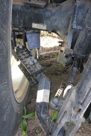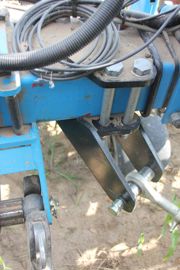 C’est le chef d’atelier de la Cuma qui a découvert cet équipement lors du Sima 2022 et l’a présenté aux adhérents. Séduits par le principe, ils ont opté pour un guidage par caméra couleur, complété par des palpeurs mécaniques. L’ensemble a été livré et installé au printemps 2023. Le fonctionnement du quatrième point est assez simple : il s’agit d’un bras qui vient se fixer sous le tracteur au niveau de la trompette gauche de l’essieu arrière. Il est positionné en diagonale sous les bras de relevage. L’autre extrémité est reliée directement à la bineuse, sur un support spécifique boulonné juste à côté du point d’attelage droit. Un vérin double effet permet de faire varier la longueur de ce quatrième point et ainsi de décaler l’outil attelé vers la droite ou vers la gauche. Il faut pour cela démonter les deux stabilisateurs afin de laisser les bras de relevage totalement libres. Grâce à cet investissement, la Cuma a revendu son interface, et a pu conserver l’ancienne bineuse. Il s’agit d’un modèle à 6 rangs, doté d’un repliage manuel des deux éléments extérieurs afin de s’adapter aux différentes exploitations qui utilisent des semoirs de largeurs différentes.