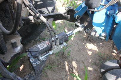 Le tout est piloté électriquement par le boîtier en cabine. Ce principe est apprécié par les utilisateurs. En effet, le tracteur de la Cuma étant relativement ancien, le chauffeur estime qu’employer en continu un distributeur à double effet ferait circuler davantage d’huile avec un risque de surchauffe. « La pose du quatrième point hydraulique n’entraîne pas de contraintes particulières, précise Guillaume Siron. Pour dételer la bineuse, par exemple, j’ai juste une broche supplémentaire à retirer, puis je peux avancer le tracteur. Pour raccrocher l’ensemble en revanche, il faut vraiment reculer bien droit sinon les fixations ne tombent pas en face des trous. Si je suis seul, je dois remonter en cabine une ou deux fois avant de trouver la bonne position, mais cela reste assez facile. »