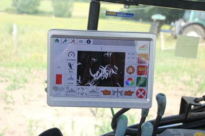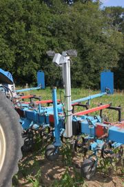 Le vérin du quatrième point hydraulique est asservi à un écran de contrôle en cabine qui reçoit les images de la caméra. Celle-ci est placée sur un mat fixé à la bineuse et filme deux rangs en même temps. Sa sensibilité permet de distinguer les nuances de couleurs. Si la plante a par exemple des reflets violets en raison d’une carence, le chauffeur ajuste le réglage de l’appareil afin de bien distinguer les adventices et le maïs. La Cuma a choisi d’installer également des palpeurs mécaniques au niveau de la bineuse. Ces capteurs prennent le relais de la caméra, notamment pour les passages les plus tardifs quand les feuilles sont plus fournies et que l’analyse d’images ne permet plus de déterminer l’axe du rang avec précision.