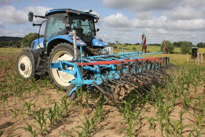 « Je pratique du binage sur maïs depuis 2009, explique Nicolas Haubert, éleveur laitier bio à Bouër, dans la Sarthe. J’adhère à la Cuma des Cinq Charmes, sur la commune voisine du Luart, qui effectue la prestation avec tracteur et chauffeur. Nous avions jusqu’à présent une bineuse classique de marque Monosem, attelée sur une interface à déplacement latéral, guidée par une cellule photoélectrique. Ce principe est intéressant, mais il n’était pas toujours efficace à 100 % . Dans les parcelles en dévers par exemple, la précision ne correspondait pas aux attentes des adhérents. La Cuma réfléchissait donc à renouveler son matériel. Le choix s’est porté sur le système de quatrième point hydraulique proposé par Hydrokit. »