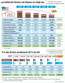 Si le nombre de vaches laitières reste stable – autour de 9,3 millions depuis vingt ans – aux États-Unis, celui des fermes a dégringolé. De — 3 % par an entre 2012 et 2017, il a ensuite reculé de 7 % par an entre 2017 et 2022. Aujourd’hui, le pays compte environ 30 000 fermes, qui produisent au total quatre fois plus de lait que la France (100 Mt). Car la chute du nombre d’élevages s’est accompagnée d’une forte hausse de la taille des troupeaux et de la productivité des vaches. En 2021, 65 % des vaches vivaient dans des troupeaux d’au moins 1 000 laitières. 39 % du lait produit provient des 3 % de fermes comptant plus de 2 000 vaches.