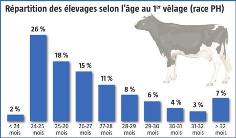 En race prim’holstein, 28 % des élevages font vêler avant 26 mois. En revanche, 13 % dépassent les 30 mois (cf. graphique ci-contre). L’évolution de la charge de travail des éleveurs peut expliquer ces résultats, avec des difficultés pour assurer la surveillance et le suivi des génisses.