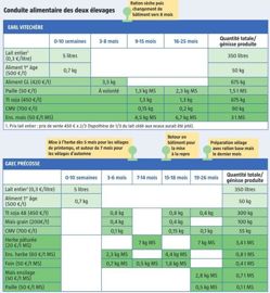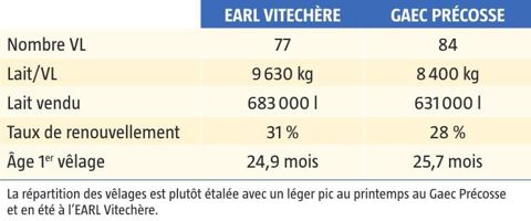 Les deux élevages conduisent la phase lactée avec du lait entier en deux repas par jour sur environ dix semaines. Au-delà de la durée, c’est avant tout le poids du veau qu’il faut mesurer ou estimer via le tour de poitrine (ruban) pour savoir quand sevrer. L’animal doit avoir doublé son poids de naissance et pouvoir ingérer 2-2,5 kg d’aliment par jour pour être sevré. Pour faciliter le travail, l’EARL Vitechère a adopté la ration sèche jusqu’à environ 8 mois. Cette stratégie, bien que coûteuse, lui permet d’assurer de bonnes performances de croissance (900 g GMQ). Au Gaec Précosse, les génisses sont mises à l’herbe dès 5-6 mois puis après avoir été confirmées gestantes. Au total, l’herbe pâturée représente les deux tiers des fourrages consommés. Avec de l’herbe de très bonne qualité, le Gaec Précosse mise sur la croissance compensatrice des génisses pour économiser un peu de concentrés en hiver. À chaque sortie et rentrée en bâtiment, les génisses sont pesées afin de vérifier que les niveaux de croissance sont suffisamment bons pour atteindre un poids au vêlage égal à 85-90 % du poids vif adulte.