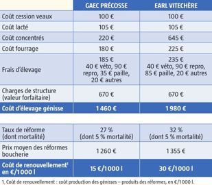 On estime que le coût d’élevage journalier d’une génisse entre 22-26 mois se situe autour de 1,40-1,70 €. Dans certains élevages, il peut être plus intéressant de viser un vêlage plus tardif (26-28 mois) pour valoriser des prairies naturelles qui ne présentent pas de très bonnes valeurs alimentaires mais qui ont l’avantage d’être économiques. Dans ce cas, l’âge moyen au premier vêlage sera bien choisi et non subi.