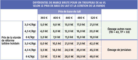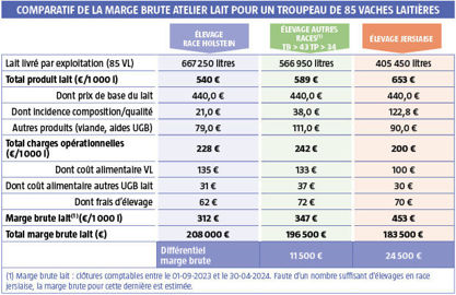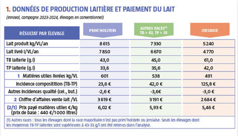 À l’époque des quotas, certains éleveurs ont misé sur la recherche de plus-values via les taux pour augmenter leur produit lait. Dans ce contexte de volumes limités, les races mixtes, bénéficiant également d’un produit viande supérieur, ont trouvé une place de choix dans plusieurs élevages. Cet intérêt était renforcé par le fait que le prix du lait était faible. La jersiaise, avec ses TB et TP très élevés, permet d’obtenir une forte incidence de la composition du lait (> 100 €/1 000 litres), un avantage de taille par rapport aux autres races (voir le tableau ci-dessous). La race n’est pas le seul facteur explicatif de la composition, les orientations génétiques et les choix de conduite techniques influencent également les taux. Sur la zone Innoval, les TB-TP moyens en race prim’holstein sont de 41,6 et 32,7, avec un écart type moyen de 2,2 et 1,3 g/kg respectivement. En race normande, avec des taux à 42,5 et 34,8, l’écart-type est de 1,8 et 1,1 g/kg. Une variabilité qui reflète les différences de conduites entre élevages.
