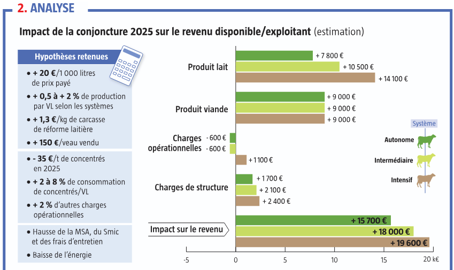Depuis 2020, le rendement apparent (lait livré par vache) a bondi de + 13 % en Bretagne et + 9 % en France selon le Cniel. Cette tendance s’explique par plusieurs facteurs, tels que les gains d’efficacité technique, l’intensification alimentaire ou la robotisation. Cette hausse de productivité s’explique également par une conjoncture laitière plus favorable depuis 2020. En effet, le prix payé du lait a augmenté de + 40 % sur la période, contre 22 % pour les charges (Ipampa). Une conjoncture qui a permis une hausse significative des revenus et des trésoreries. Le résultat courant dépasse les 35 000 €/UMO exploitant depuis 2021, alors qu’il était de 25 000 € en moyenne sur la période 2015-2019 (Rica). Avec environ + 20 €/1 000 l de prix payé sur 2025 (versus 2024) et + 1,3 €/kgc de cotation sur les réformes laitières, les produits de l’atelier lait vont significativement augmenter. Quels seront les impacts sur les revenus ? Tous les systèmes vont-ils tirer profit de cette conjoncture ?