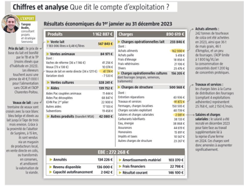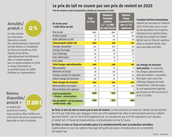 Enfin, du trèfle blanc nain est sursemé dans les prairies naturelles, et, dans le but de faire durer la luzerne au-delà de trois ans et d’y exploiter une coupe précoce, les éleveurs testent le sursemis de trèfle violet et trèfle incarnat. Ces fourrages permettent de composer une ration complète à base de maïs et sorgho (7 à 12 kg MS/jour/VL), ensilage d’herbe (prairies et dérobées, 7 à 12 kg), enrubannage de luzerne (1 à 1,5 kg), tourteau de colza (4 kg) et concentré céréalier (1 kg dans la ration et 1 kg au Dac). L’analyse du coût de production du lait (voir ci-dessus) montre qu’il existe une importante marge de manœuvre pour réduire les charges opérationnelles liées aux achats de concentrés et à la production fourragère. « Produire des fourrages riches en protéines est un moyen de limiter les achats de tourteaux, mais représente un coût par l’achat de semences de légumineuses. C’est aussi une façon de sécuriser notre approvisionnement en protéines et de laisser de l’azote dans les sols pour les cultures de vente de la rotation. C’est encore difficilement chiffrable. Toutefois, nous prévoyons d’augmenter nos surfaces en luzerne grâce aux terres reprises en 2024 : c’est utile à la fois pour l’alimentation du troupeau et pour optimiser notre production céréalière. »