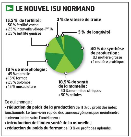 VADEMECUM ET ARNICA SOUS L'ÉTENDARD « MATIÈRE UTILE », Aubray et Aviva présentés sous « Santé de la mamelle », Alma et Arantilly sous la bannière « Mamelle et aplombs », les entreprises de sélection et l'Organisme de sélection normand ont profité du Space pour vulgariser le nouvel Isu de la race normande via ses nouveaux taureaux. Le progrès génétique qui sera permis en lait par la rotation rapide des taureaux génomiques permet d'accorder plus de poids aux index fonctionnels. De nouveaux critères apparaissent : mammites cliniques, intervalle vêlage-1re IA (voir ci-dessous).