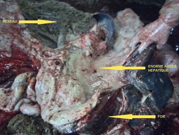 Après ingestion, ce corps étranger a donc gentiment traversé le réseau (où il aurait pu avoir la chance d'être immobilisé par un aimant si celui-ci s'y était trouvé au bon moment), pour se retrouver planté dans le foie, générant une infection locale (abcès rempli de pus) qui s'est développée et a entraîné la dégradation de l'état de l'animal.
