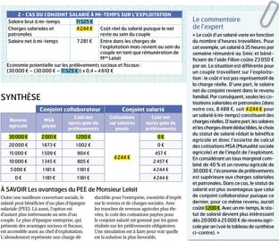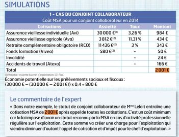 Conjoint collaborateur, chef d'exploitation ou salarié : le conjoint actif sur l'exploitation a le choix entre trois statuts. Avec des différences en termes de protection sociale. Le salarié est mieux couvert pour la retraite et la prévoyance, mais les cotisations suivent. Si l'on compare le conjoint collaborateur et le salarié, en 2014, le premier cotise au titre d'une retraite proportionnelle sur la base de 3,28 % de l'assiette du chef d'exploitation (assurance vieillesse individuelle). S'y rajoute la retraite forfaitaire (434 € d'assurance vieillesse et 343 € de retraite complémentaire obligatoire). Le salarié cotise avec son employeur, sur la base de son salaire.Sa retraite sera calculée sur la base de 50 % de son salaire brut.