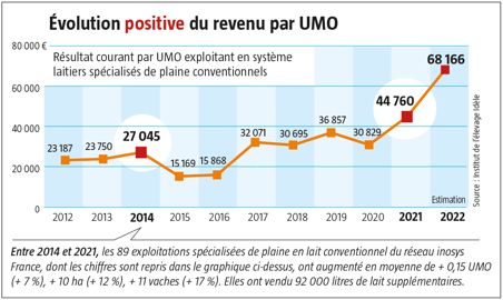 La crise du lait en 2015-2016 a fait du mal aux exploitations qui avaient beaucoup investi. Malgré tout, et à l’exception du bio, le revenu des exploitations laitières s’est globalement amélioré ces dernières années, comme en témoignent les éléments présentés dans le graphique ci-contre.