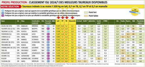 De la sélection de L’Éleveur laitier, sept taureaux dotés d’une combinaison traite-cellules équilibrée émergent : Palace (Nirvana/Fulco), Sniper (Ouijoli/Mille DT), Ravaillac (Orfèvre/Giga Isy), Uruguay (Roisoleil/Oltraford), Sesame (Oltraford/Lima), Speaker (Placebo/Manchester), Stakanov (Platini/Lhassa). À noter que, parmi eux, seul Uruguay est nouveau. Chez les cinq premiers, on retrouve l’influence de Mercredi (Eville-Saintyorre) qui affiche aujourd’hui 0,5 en cellules et traite.