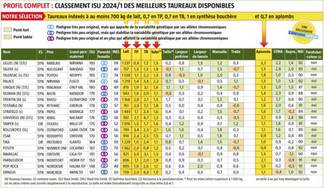 Le leader de la race Uguel est dans cette moyenne (1 237 kg). Il est aussi le numéro un de la sélection de L’Éleveur laitier sur les profils complets et de production. Il a de quoi séduire. Quasiment tous ses index sont positifs, avec une mention spéciale sur les fertilités vaches et génisses, respectivement de 1,4 et 1,2 (mais -1 en intervalle vêlage – première IA). Il a hérité ces qualités de son père Rabelais (174 points d’Isu), dans le top 10 des inséminations artificielles premières (IAP) 2023 (lire l’encadré ci-dessous). Tous deux améliorent peu la taille, ce qui contribue sans doute au bon niveau de la « repro ». Le potentiel laitier élevé et une taille amélioratrice sont en effet corrélés négativement à ce critère. Uguel va plus loin en proposant des animaux larges. Synetics le conseille sur Requiem, Platini, Placebo, Paimont ou encore Marvel.