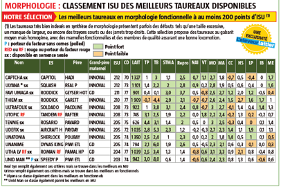 Le meilleur de ce groupe en Isu se nomme Unifoux P et il figure par ailleurs dans le classement des meilleurs taureaux sur les index fonctionnels. À 151 de matière utile et 220 points d’Isu, il offre un très haut niveau de qualité fonctionnelle et de bons membres. Il écarte les trayons à l’avant (- 1,4). Pour profiter de ces qualités, il faudra l’accoupler avec des vaches d’un bon gabarit (- 0,9 en taille, - 1,3 en profondeur, - 1 en bassin).