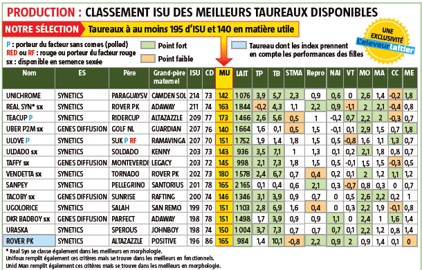 Notre sélection des meilleurs en index fonctionnels retient cette année un nombre limité de taureaux. En cause, bien souvent, une traite trop lente mais aussi une santé de la mamelle insuffisante. En revanche, on trouve dans le haut du classement général de nombreux taureaux très bien notés en reproduction et en santé du pied.