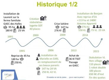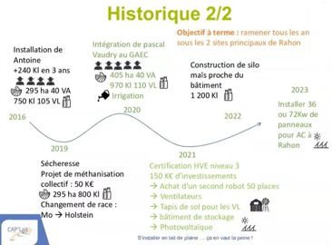 - 2021 : nouveaux investissements (robot de traite 50 places, équipements pour le bien-être des vaches, bâtiment de stockage, projet photovoltaïque en autoconsommation en réflexion) (déjà méthanisation depuis plusieurs années).