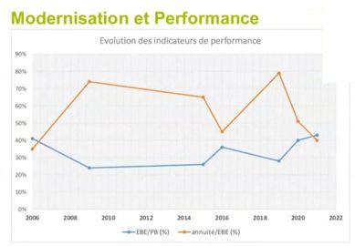 Les courbes annuités/EBE (en rouge) et EBE/produit brut (en bleu) permettent de visualiser l'efficacité du système.