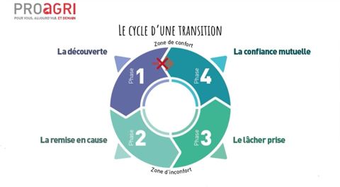 « Toute transmission d’exploitation ou mise en société agricole, même familiale, suit un cycle en quatre phases (cf. schéma ci-dessous) », précise Pauline Ducrocq. « Comme un couple », compare-t-elle. La découverte d’abord, où « tout est tout beau tout rose, ça ne peut que bien se passer ». La remise en cause, ensuite, du projet et des personnes : « Chaque partie veut s’affirmer, montrer ses envies, ses valeurs, le repreneur veut apporter sa pierre à l’édifice et le cédant ne comprend pas pourquoi il veut tout révolutionner, c’est très inconfortable. »