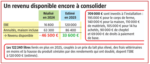 Malgré la remise en état et les aménagements, Armand Guilbert n’est qu’au milieu du gué. Partant de zéro, il a choisi de consacrer 95 % des 90 000 € de création de cheptel accordés par la banque à l’acquisition des 40 vaches en lactation pour amorcer la pompe de la trésorerie. « Les 5 % restants sont l’achat de cinq génisses amouillantes et de génisses non sevrées. Ces dernières ont vêlé entre septembre et décembre dernier. » Il a livré 363 140 litres à Eurial Ultra Frais sur l’année civile 2024 pour une attribution de 400 000 1 et 485 380 litres en 2025. « Le dépassement de 37 000 l n’a pas été pénalisé grâce à la mutualisation des volumes de l’Oplase, qui est en sous-réalisation par rapport à sa référence contractuelle. Je me suis appuyé sur cet excédent pour demander 150 000 litres supplémentaires pour 2026, ce qu’elle m’a facilement accordé. »