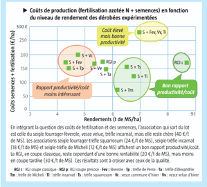 Côté MAT ramenée à l’hectare, les mélanges seigle fourrager-légumineuses ne se démarquent pas vis-à-vis du RGI classique qui produit jusqu’à 1 tonne de protéines/ha. Mais le RGI a besoin d’azote. Avec une rapide simulation de coûts pour 90 unités d’azote/ha (ammonitrate 33,5 % à 1,12 €/uN, 20 €/h de main-d’œuvre, 2 €/ha de tracteur 100 ch 4 roues motrices, 1,90 €/ha d’épandeur à engrais 24 m classique), la culture de RGI en dérobée se monte à 107 €/ha, contre 0 € pour les cultures en association. Il faut également prendre en compte « le coût des semences et les mélanges sont parfois coûteux, rappelle Mickaël Venot. En mélangeant des légumineuses, il faut compter en moyenne 150 €/ha et autour de 60 €/ha pour du RGI.