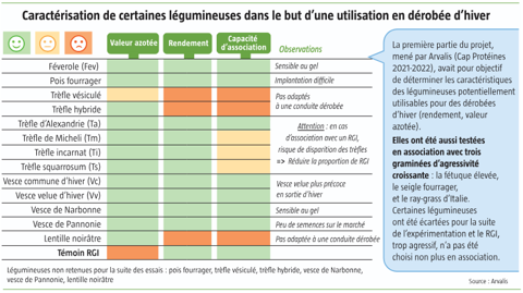 À l’avenir les travaux porteront sur le seigle forestier et l’avoine d’hiver. « Les seigles sont sensibles au piétin-échaudage. De fait, ils maintiennent une pression sur la parcelle avec ce champignon. De même, il faut rester vigilant à la date de coupe, sinon le seigle fourrager perd rapidement en valeur alimentaire. Le seigle forestier et l’avoine d’hiver sont plus tardifs et l’avoine moins sensible au piétin », analyse l’ingénieur. Qui s’interroge aussi sur la réserve hydrique du sol, après un mélange et avant un maïs fourrage, par exemple, ou encore sur la dose d’azote à apporter pour maintenir certaines légumineuses en association avec la céréale dans la parcelle tout en optimisant le rendement de ces dérobées. Des travaux à explorer dans les années à venir pour le Cap Protéines + 2024-2026.