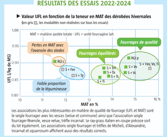 Par ailleurs, ils auront une meilleure valeur alimentaire, surtout pour la teneur en MAT. « Nous n’avons pas constaté d’effet significatif de la date de semis sur la production des différentes dérobées », fait observer Mickaël. Il rappelle que « le RGI perd trois points de MAT en trois semaines et la portance des sols ne permet pas toujours d’aller le récolter au bon stade ». Autre constat de terrain : la féverole a gelé dans certaines parcelles et le trèfle de Perse a disparu en sortie d’hiver. « Les associations à base de vesce (vesce velue d’hiver et vesce commune d’hiver) produisent une biomasse identique à un RGI précoce », fait aussi remarquer l’ingénieur.