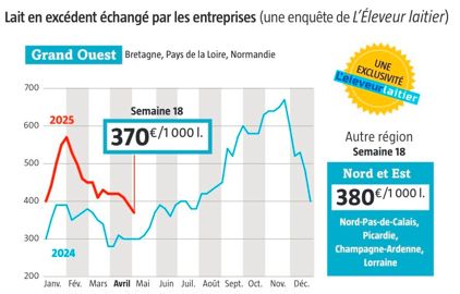 En semaine 18, il s’élève en moyenne à 370 € dans l’Ouest et à 380 € dans l’Est, mais avec des prix au départ des citernes qui peuvent tomber à 320 €. Cela n’a rien d’étonnant. Cette baisse est habituelle au printemps et correspond au pic saisonnier. Cette année, il s’est brusquement accéléré, dépassant les pics de 2023 et 2024. Les industriels ne sont donc pas demandeurs de lait. Cette tendance à la baisse devrait se poursuivre car le mois de mai est jalonné de ponts fériés, affectant la consommation, mais aussi le fonctionnement des laiteries. Le lait Spot est donc orienté chez les voisins frontaliers, vers l’Espagne, l’Italie, le Benelux.
