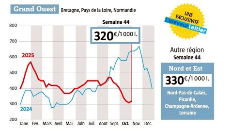 Il est difficile d’établir un prix Spot, tant les prix varient d’un jour et d’une destination à l’autre. Pour la semaine 44, ils s’étalent de 280 € à 350 €/1 000 l, voire à 380 €. On est très loin des 680 € de l’an passé à la même période. La courbe de collecte n’a jamais été aussi haute les années passées à la même époque. Le prix du lait élevé croisé avec un coût des intrants en baisse incite les éleveurs français, mais aussi européens, à stimuler la lactation de leurs vaches par un peu plus de concentrés. L’automne doux et pluvieux et la pousse de l’herbe qui va avec, accentuent le phénomène.
