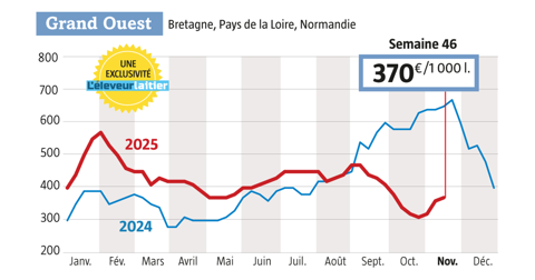 Le marché du lait Spot a repris quelques couleurs depuis quinze jours. Le prix était descendu à 320 €/1 000 l (pour traduire une fourchette entre 280 € et 350 €). En semaine 45, il est remonté à 360 €. Il augmente de nouveau de 10 € en semaine 46. Il y a un peu moins d'excédents de lait sur le marché. Après dix semaines de courbe ascendante, la collecte semble se stabiliser en semaine 43 (dernier relevé de FranceAgriMer). La Bretagne et les Hauts-de-France initient le mouvement (-1 % par rapport à la semaine précédente).