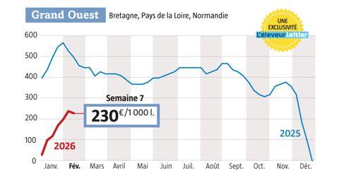 Le prix du lait Spot est stable en semaine 7. Après 240 € en semaine 6, il est estimé à 230 €/1 000 l (250 € en début de semaine et 200 € en fin de semaine). La collecte toujours dynamique n’est pas absorbée en France par une demande du marché Spot en lait liquide. Sa destination principale reste l’Espagne, qui est moins preneuse cette semaine. Selon les courtiers, seule la baisse de la production pourrait calmer les marchés. Ils ne croient pas en une action de régulation de la Commission européenne car les prix d’intervention du beurre et de la poudre sont bien plus bas que les cotations actuelles.