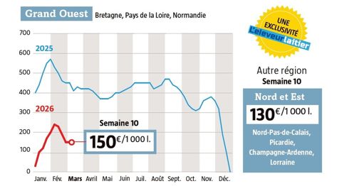 Les acheteurs traditionnels, eux, ne sont pas au rendez-vous pour plusieurs raisons. Certains ont conforté leur approvisionnement par de nouveaux producteurs, notamment par la reprise de livreurs de Lactalis concernés par les ruptures de contrat. La consommation de lait UHT est à la peine. L’Italie et l’Espagne ne jouent pas leur rôle habituel d’amortisseur. En semaine 10, le prix du lait Spot varie de 110 € à 170 €/1 000 l selon les régions. La fourchette haute est dans le grand Ouest à 150 €-160 €/1 000 l, la fourchette basse dans l’Est à 120 €-130 €. Quant au Sud-Ouest, tourné vers l’Espagne, il se situe à 140 €-160 €. Le prix Spot du lait liquide écrémé subit ces niveaux historiquement bas : entre 10 € et 30 €/1 000 l.