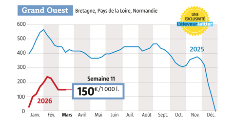 Cette stabilité apparente depuis trois semaines sur le lait liquide cache un marché mouvementé. Côté bonne nouvelle, la perspective des fêtes de Pâques crée un besoin en matière grasse (beurres en plaquettes et en cube). Quant à la crème, son prix explose. La tonne de crème a gagné 1 000 €. Les ventes en début de semaine 10 pour la semaine suivante cotaient à environ 4 150 €, en fin de semaine, à 5 150 €. Les industriels, réactifs, utilisent leurs excédents pour fabriquer l’ingrédient… Et le lait écrémé qui va avec. Résultat : alors qu’il se vendait déjà difficilement, il est devenu invendable. Son prix est à zéro ou atteint un petit 10 €/1 000 l en semaine 11.