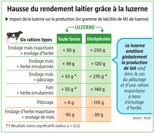 Pour chaque ration, l’apport de luzerne, sous toutes ses formes, permet globalement d’obtenir une hausse significative du rendement laitier (voir le tableau ci-dessus). Il existe cependant deux exceptions à cette observation : la ration reposant sur le pâturage (+ 0 g de lait/kg de luzerne) et la ration à base d’ensilage d’herbe majoritaire et d’ensilage de maïs (-95 g de lait/kg de luzerne). Une hypothèse pour expliquer ce phénomène serait un « effet de dilution » lié à la présence d’herbe fraîche. Cet effet positif et négatif sur certaines rations est aussi perçu avec l’ajout de luzerne déshydratée. « Le gain le plus significatif s’observe dans la ration ensilage de maïs majoritaire et ensilage d’herbe », relève Maéva Caillat (250 g/kg).