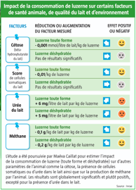 Côté fécondité, c’est-à-dire l’intervalle entre le vêlage et la conception d’un nouveau veau, l’impact de la luzerne est peu ou pas marqué. Cependant, dans le cas de la luzerne déshydratée, l’effet positif sur la fécondité semble un peu plus présent. L’ingénieure de recherche s’est aussi intéressée à l’impact de la luzerne sur la qualité du lait. Ajouter de la luzerne sous toutes ses formes ou de la luzerne déshydratée aurait tendance à faire baisser le taux protéique et monter le taux butyreux, avec à nouveau un effet plus important dans le cas de la luzerne déshydratée. Les évolutions positives comme négatives sont cependant assez faibles. « Peut-être y a-t-il aussi un effet de dilution pour le taux butyreux puisque la vache produit plus de lait », relève Maéva Caillat. Sur le plan pratique, la grande limite de ces résultats est le rapport prix de la luzerne et prix du lait. Si le prix du lait est trop bas, malgré la hausse de rendement liée à l’ingestion de luzerne, il ne couvrira pas l’achat de l’aliment.