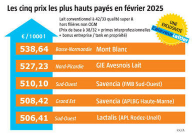 Sans le rattrapage de Mont Blanc, le GIE Avesnois Lait (31 Ml) se maintiendrait sur la plus haute marche du podium. Il a versé 527,23 €/1 000 l (prix de base à 510 €). Vendus à la coopérative belge Solarec, les volumes de février bénéficient des prix nord-européens au-dessus des 500 €. Sa maison-mère, la Laiterie des Ardennes, a payé 530,55 €/1 000 l, selon EDF-ZuivelNL International Milk Price Comparison. Précisons que ce montant comprend 1 g/kg de plus de TP que celui du GIE dans notre observatoire.
