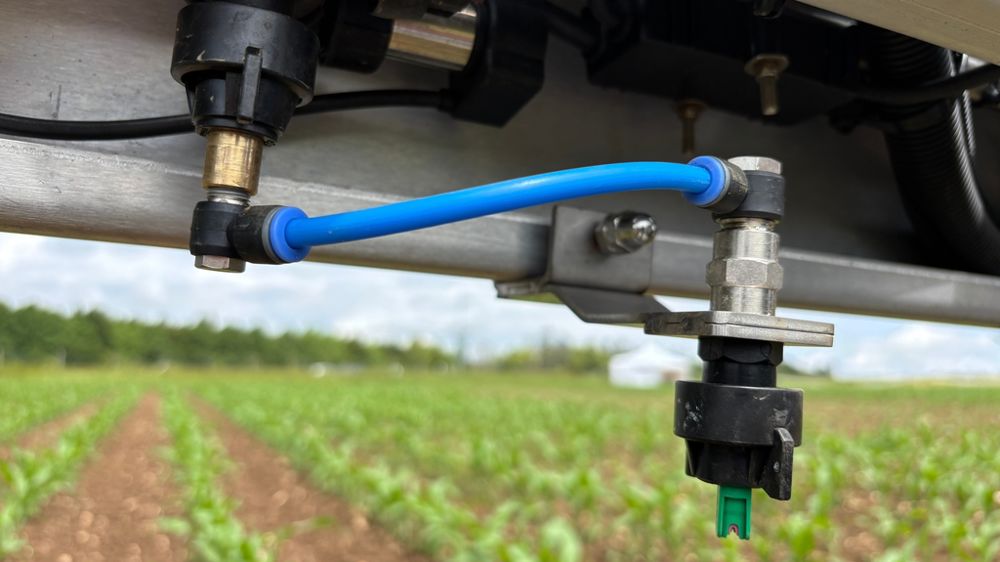 Quand on ne traite chimiquement le maïs que sur le rang, on diminue automatiquement la dose de moitié. Mais peut-on y parvenir avec un matériel classique et sans surcoût ? C’est la question à laquelle a voulu répondre l’équipe de la chambre d’agriculture de Bretagne qui mène des essais sur les cultures à la station expérimentale de Kerguéhennec (Morbihan). Ils ont testé en 2025 le système On’Row, développé par Syngenta et commercialisé par Solhead. « Il s’agit d’un écrou porte-buses qui peut être fixé aisément, sans perçage, sur n’importe quelle rampe de pulvérisateur », explique Pierre Gautier, technicien d’expérimentation à la station. Des pattes de fixation serrées sur la rampe permettent de positionner la buse. Elle est alimentée de façon classique via un tuyau. Avec ce système, le traitement localisé sur le rang devient possible puisque les buses peuvent être espacées de 75 cm, comme les lignes de semis. Elles sont disposées selon un angle précis de façon que le jet soit moins large et homogène sur le rang. En effet, la régularité est un frein au désherbage localisé. En plein, il y a un triple recouvrement. Chaque point traité est arrosé par trois buses afin que la dose soit la même partout.