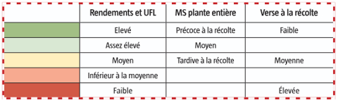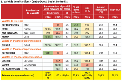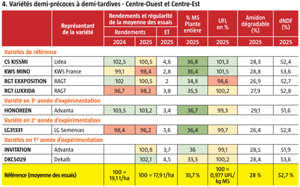 Parmi les plus tardives, LID3999C se distingue par de bons rendements en première année et une valeur UFL élevée, malgré une faible teneur en amidon. Précoce à la floraison, LG31301 obtient de très bons rendements et une valeur UFL à la fois élevée et équilibrée entre fibres et amidon digestibles (vigilance sur la tenue des tiges). Citons également KWS Zuko, pour ses rendements élevés dans la zone nord-est et Collection, pour son équilibre entre rendements et valeurs alimentaires.